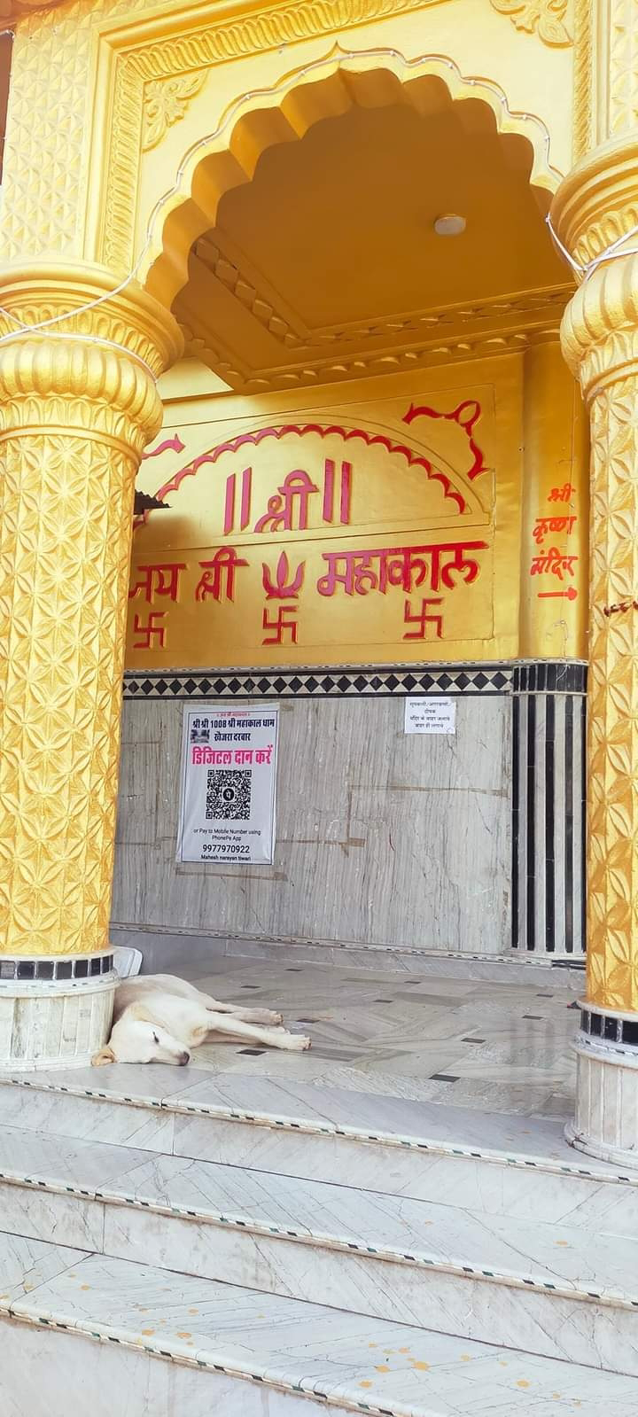 🚩 सुंदर खेतों के बीच से होकर जैसे ही मंदिर की पहली झलक मिली तो उसकी सुनहरी आभा देखकर मन प्रसन्न हो गया... सुनहरे रंग से रंगी हुई मंदिर की भव्य इमारत स्वर्ण मंदिर सी आभा दे रही थी.... मंदिर परिसर में पहुंचकर जब मंदिर को सामने से देखा तो सचमुच महाकाल मंदिर की इमारत याद आ गई... सुंदर डिज़ाइन किए हुए ऊंचे-ऊंचे स्तंभ वाले इस मंदिर का वहां एक बोर्ड पर पूरा परिचय लिखा था... यह परिचय इस प्रकार था....⤵️